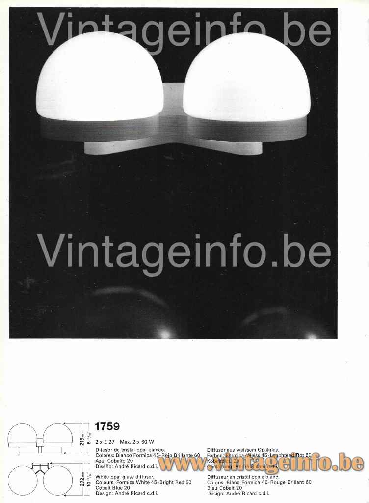 Other versions: This André Ricard Metalarte wall lamp exists in several variations. It exists with a single globe and was also made as a table lamp. Designed in 1969, this wall lamp received an iF Design Award in 1972. The table lamp can be found here on Vintageinfo.
