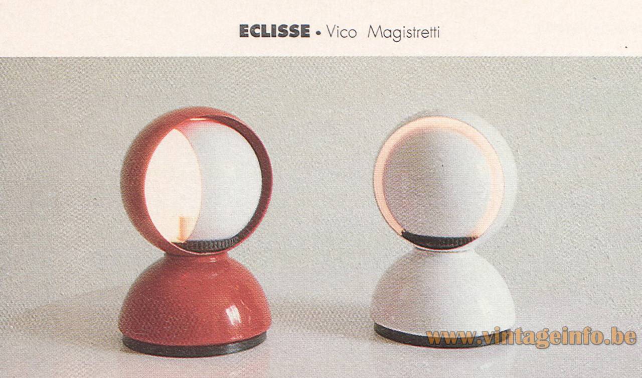 The Eclisse went in production in 1966. You can find the Artemide Eclisse table lamp in the catalogue from 1973 here on Vintageinfo: Artemide catalogue 1973 page 1. It can also be used as a wall lamp, a recess is provided: Artemide catalogue 1973 page 3.