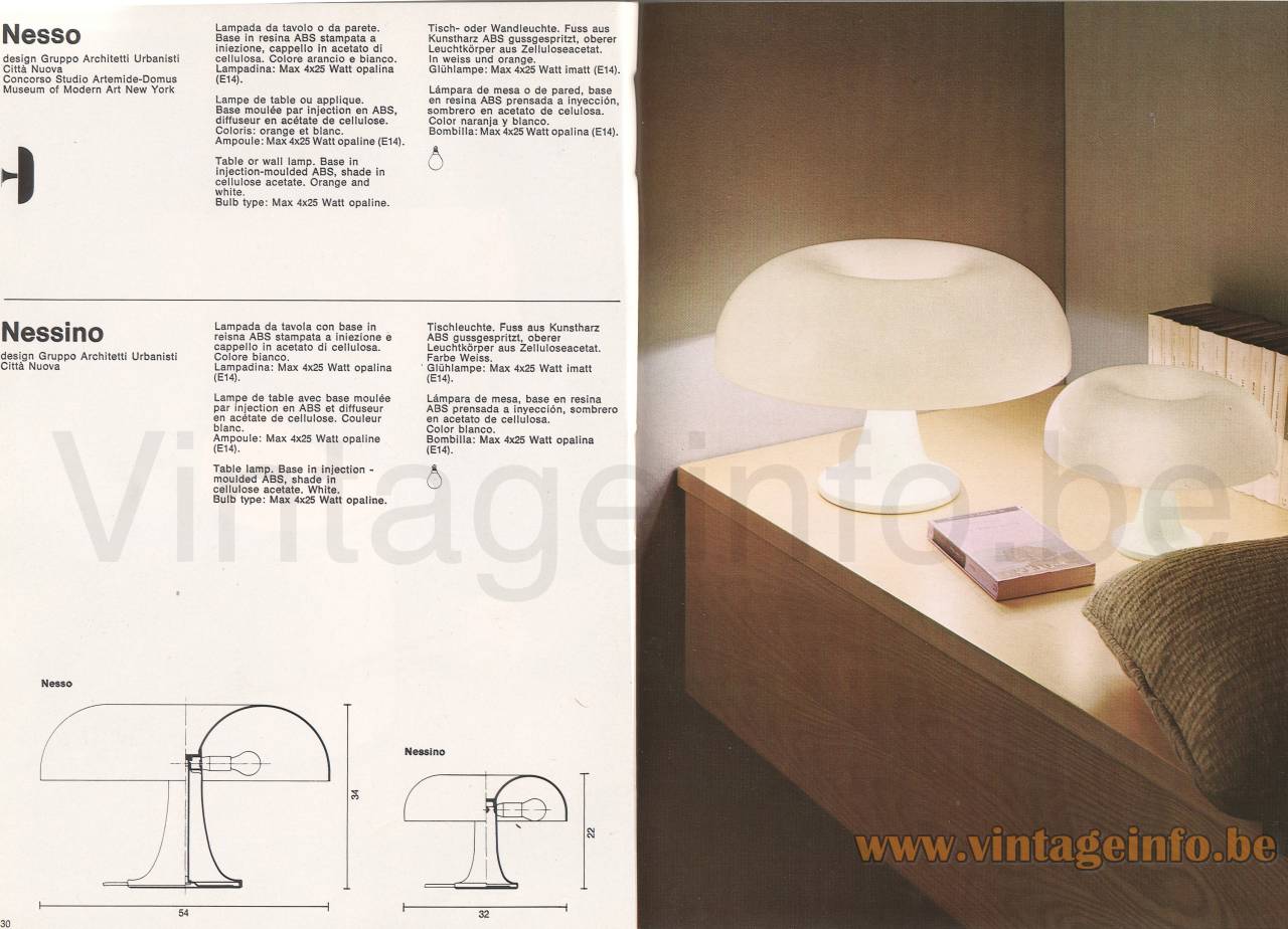 The Artemide Nesso and Nessino table lamps in the 1976 catalogue with a scheme and the dimensions.