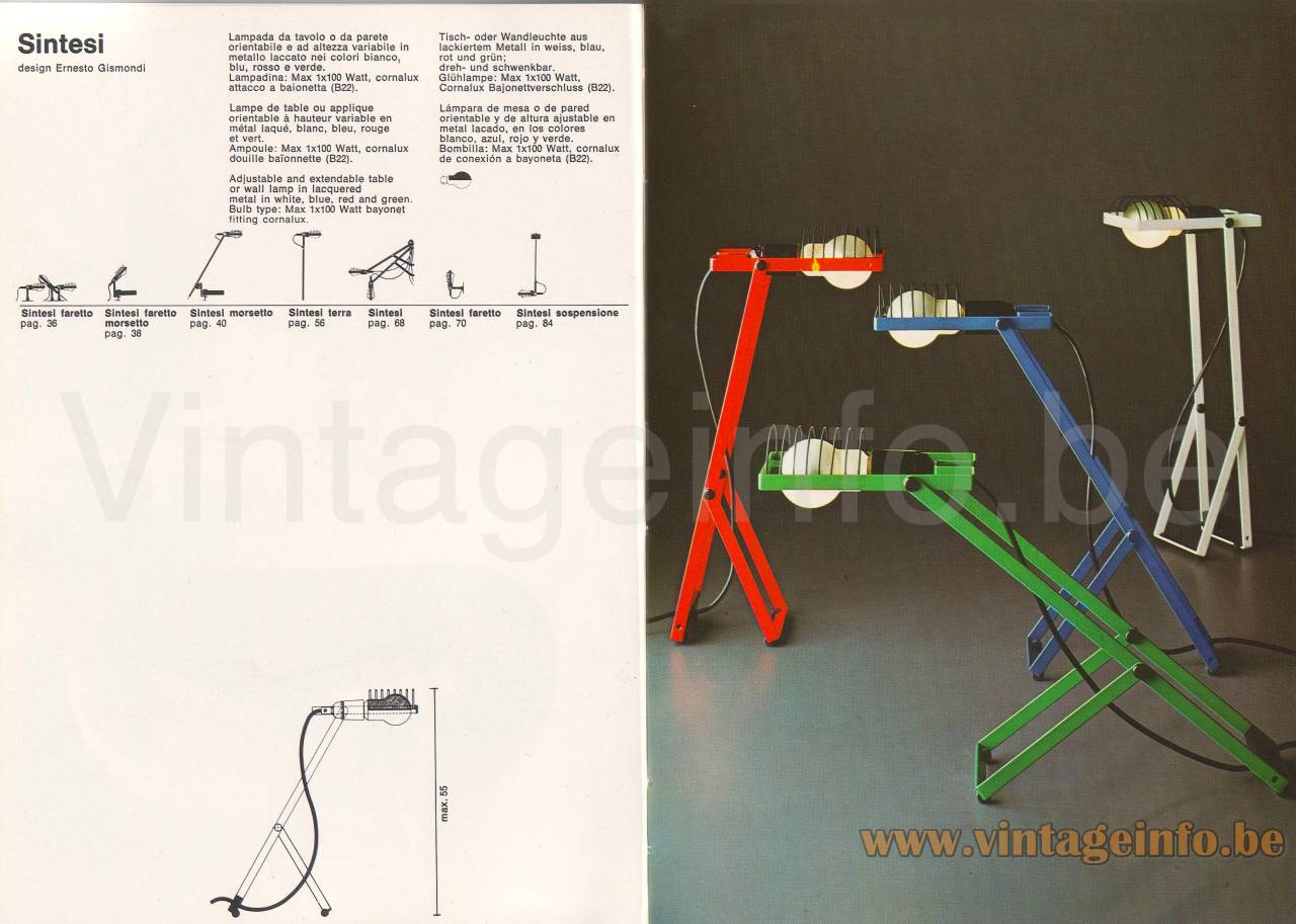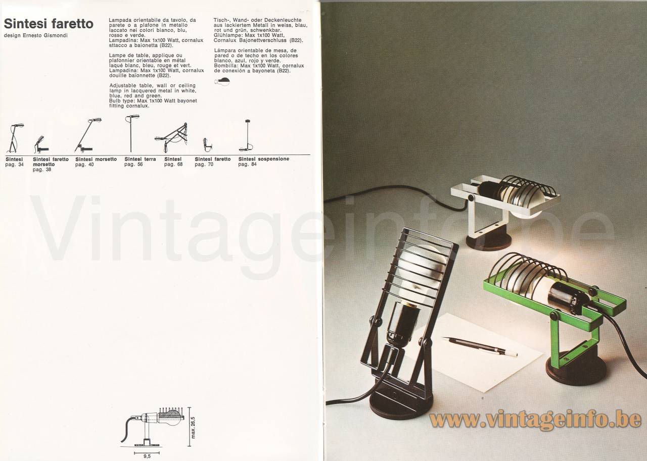 In this part of the 1992 catalogue picture the Sintesi, Sintesi Pinza and Sintesi Faretto Tavolo. The complete catalogue can be explored over here.