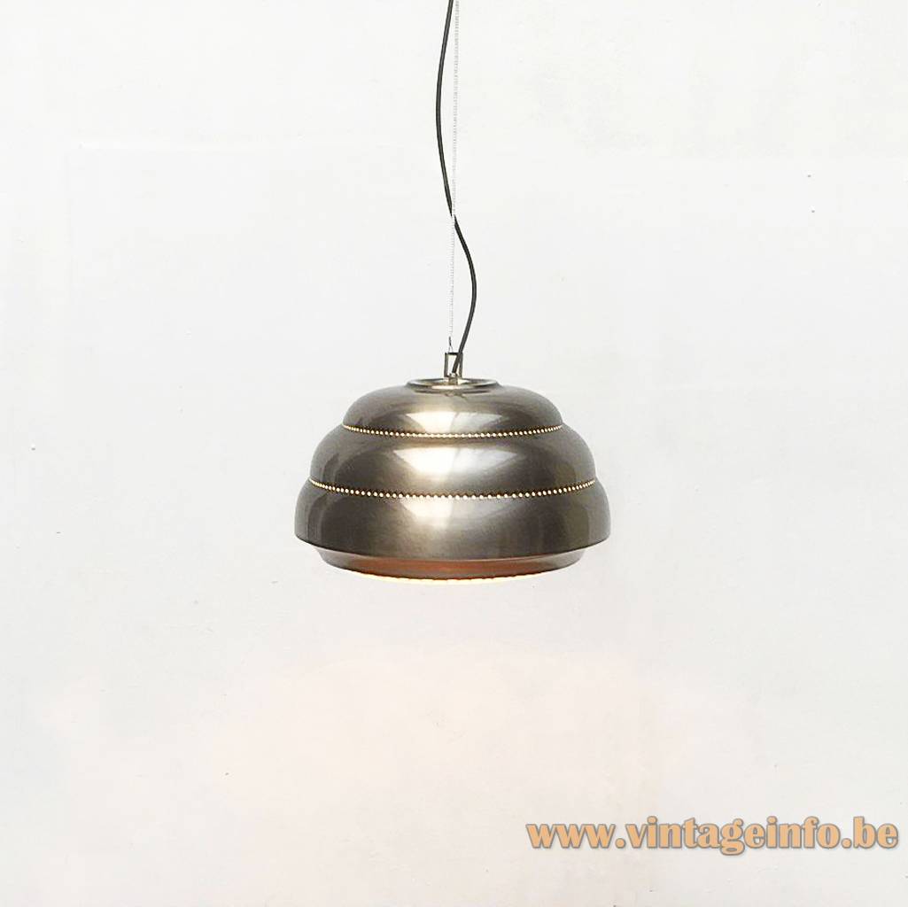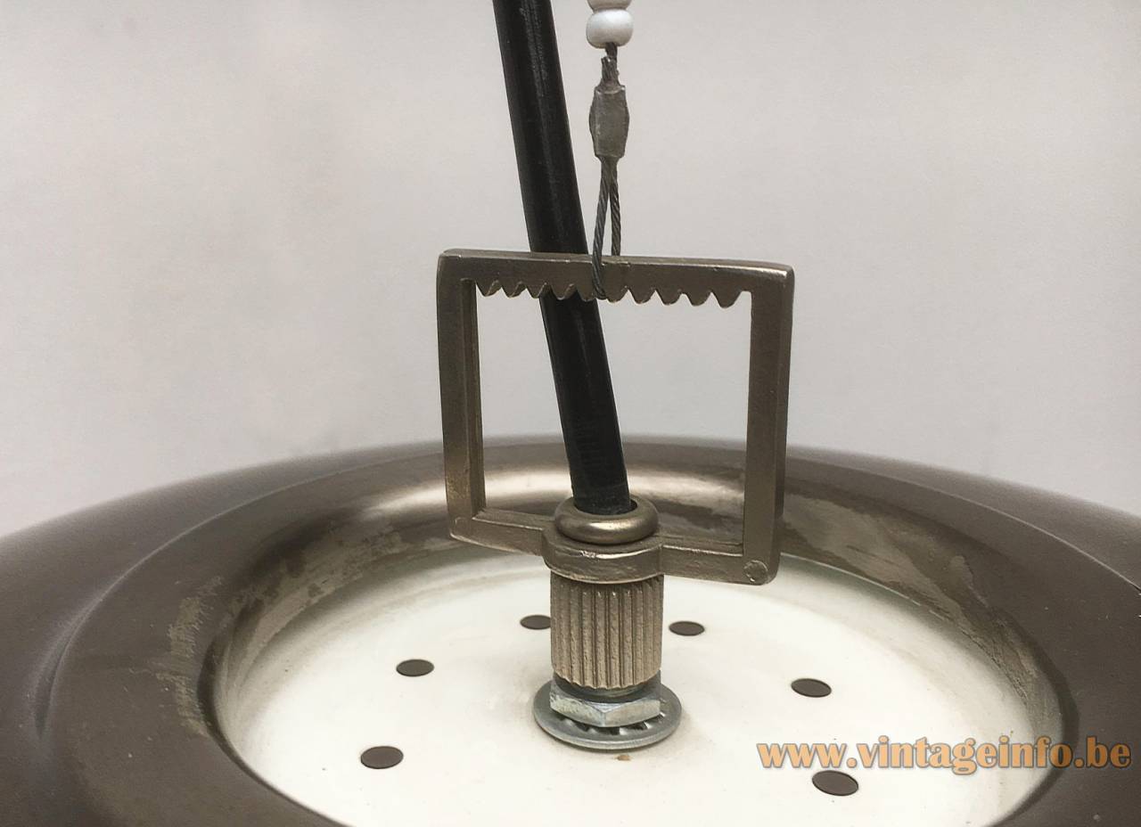 The Venezia was produced in several finishes, including polished brass, nickel-plated brass, and dark grey painted metal. It is suspended from a safety-conductor cable with a standard drop of approximately two metres.