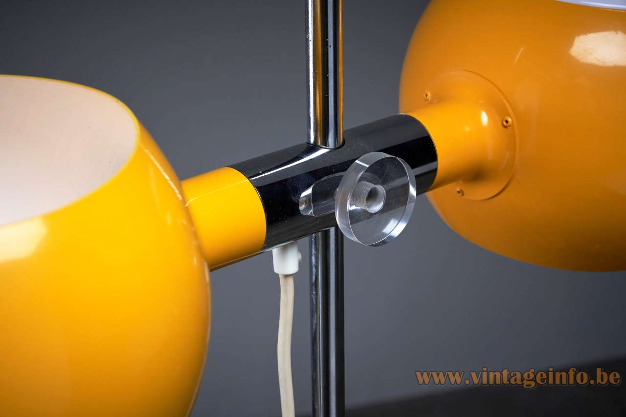 Materials: Yellow painted flat round & rounded base, cast iron counterweight inside. Chrome stem and parts. Clear acrylic ornamental adjustment screw. White painted globe lampshades, white painted inside. White acrylic diffusers on top. 2 galvanised metal E27 sockets.