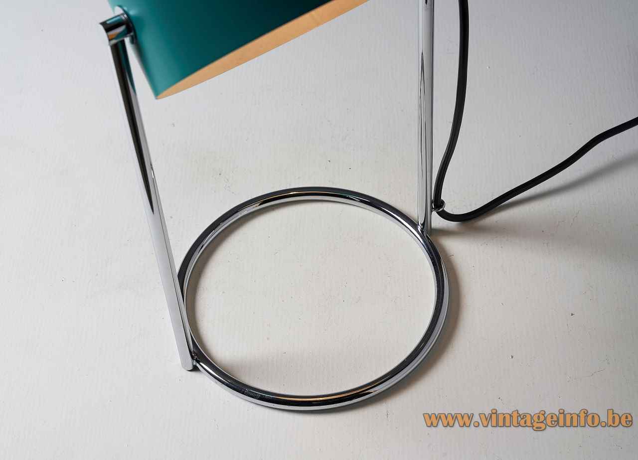 Materials: Round chrome ring base & rods. Petrol-green aluminium lampshade. E14 lamp socket.
