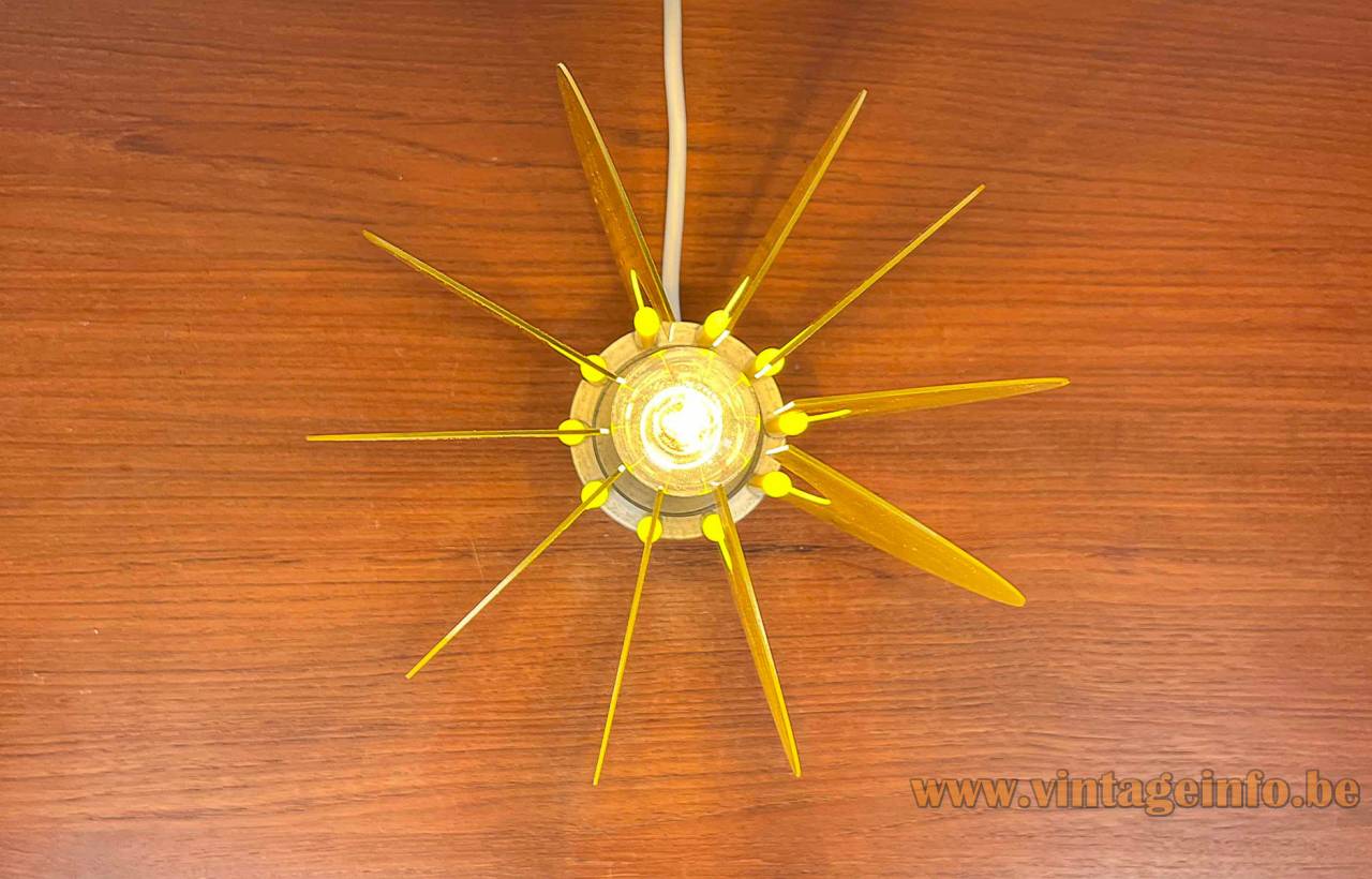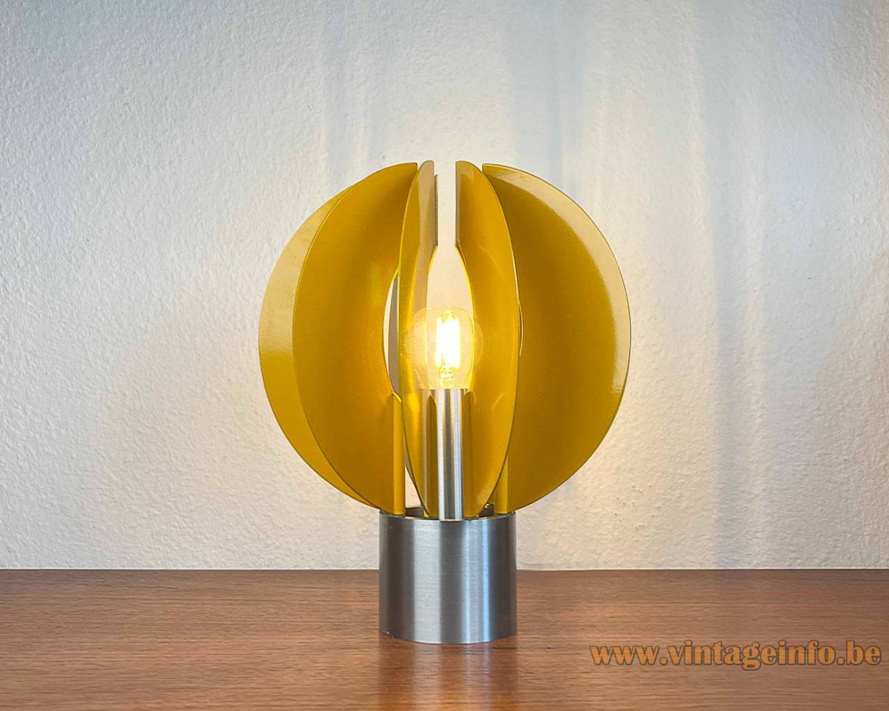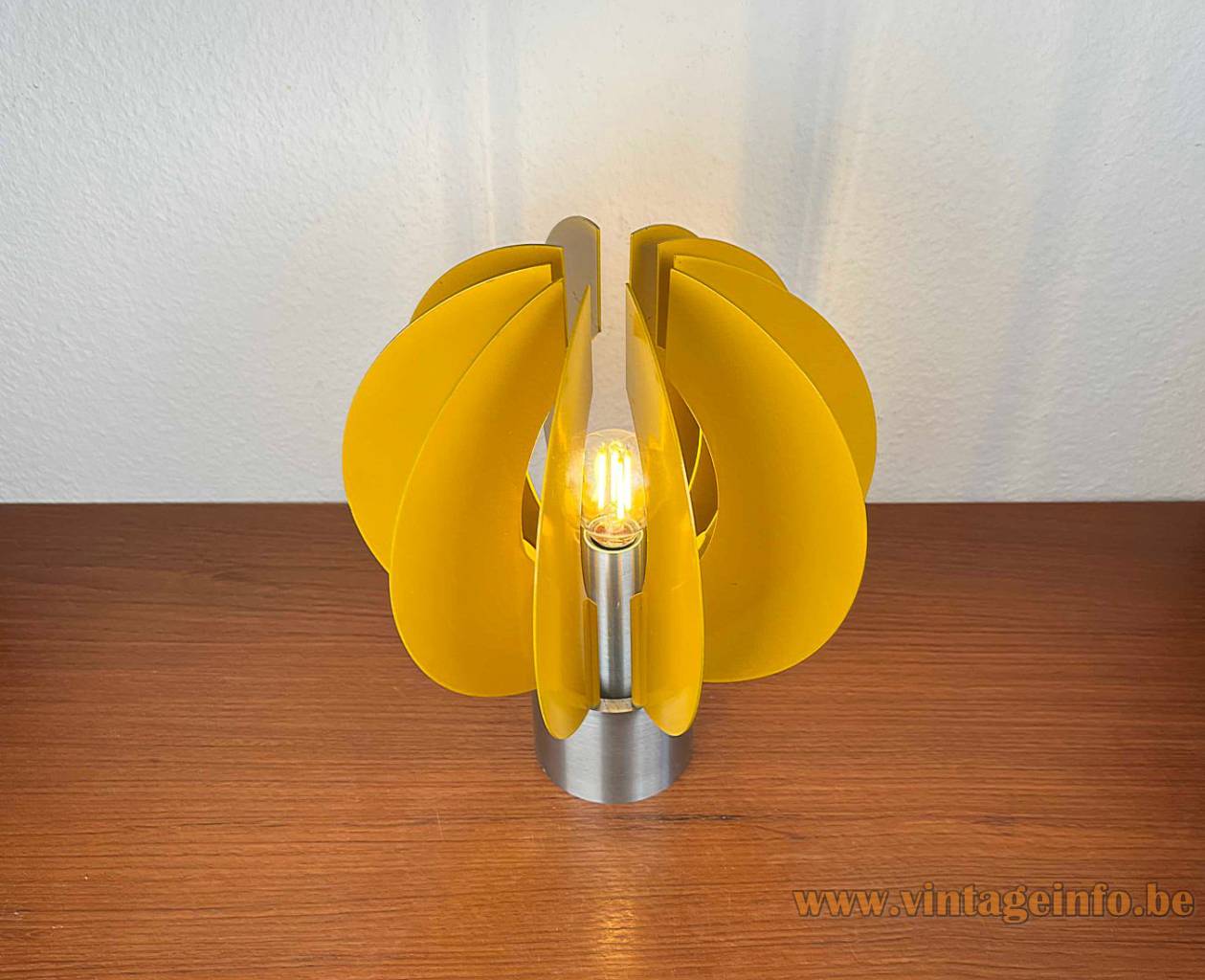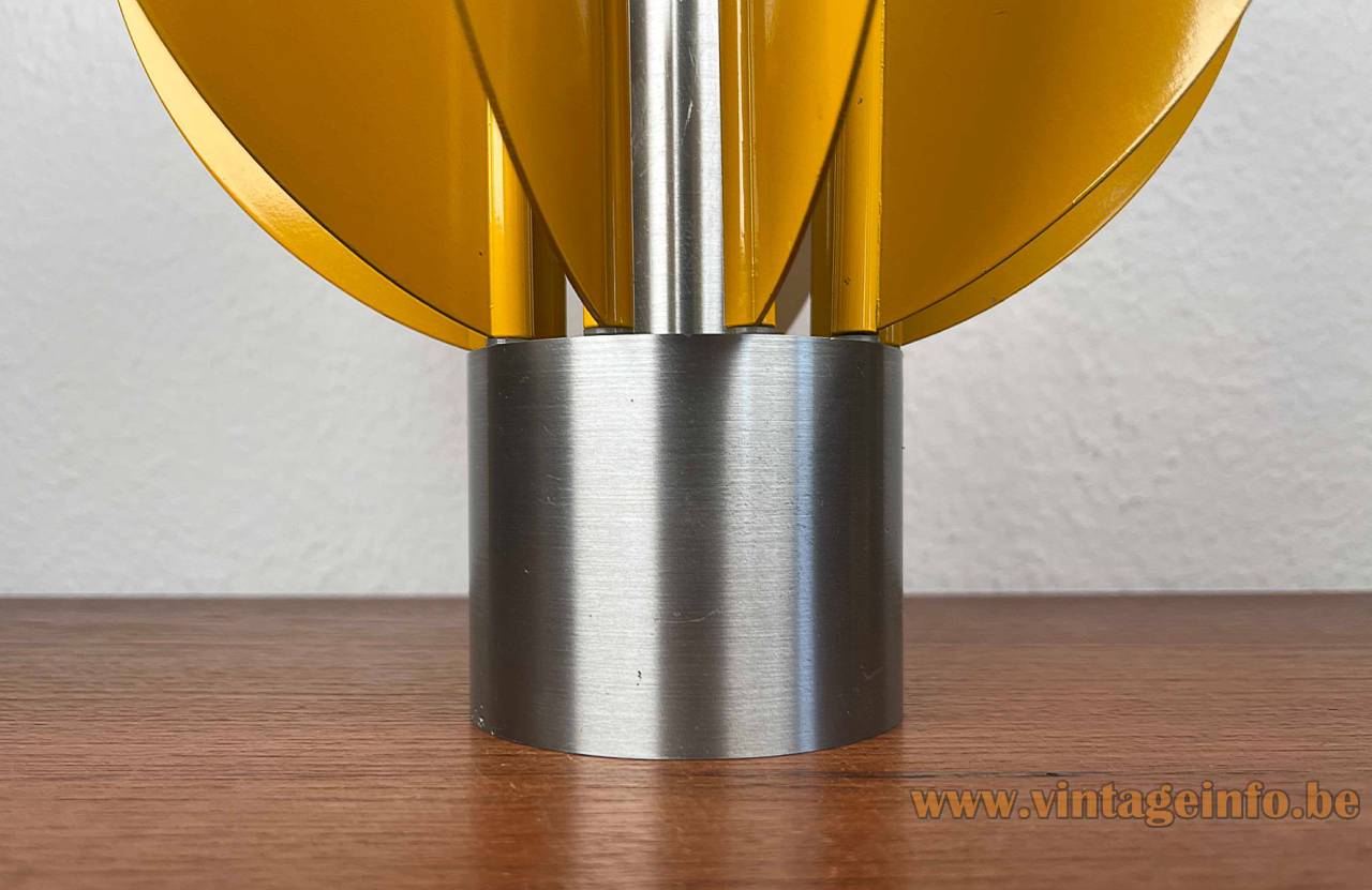 Materials: Round brushed aluminium base. Ten adjustable yellow-painted aluminium flower-petal–slat lampshade. Bakelite E14 socket.