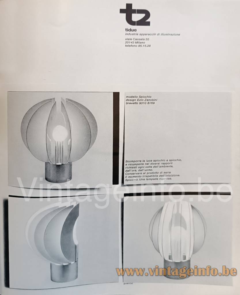 Produced by Tidue (T2), an Italian lighting manufacturer based in Milan. Active in the late 1960s and early 1970s, the company was located at Viale Cassala 55, 20143 Milan (telephone 85.15.28). Little documented information about the firm has survived, but period catalogues and magazines confirm its activity as an independent manufacturer of lighting fixtures. The lamp is documented in Italian publications from 1970, including Formaluce (issue 15, 1970), Interni (issue 43, 1970) and Abitare (issue 84, 1970).