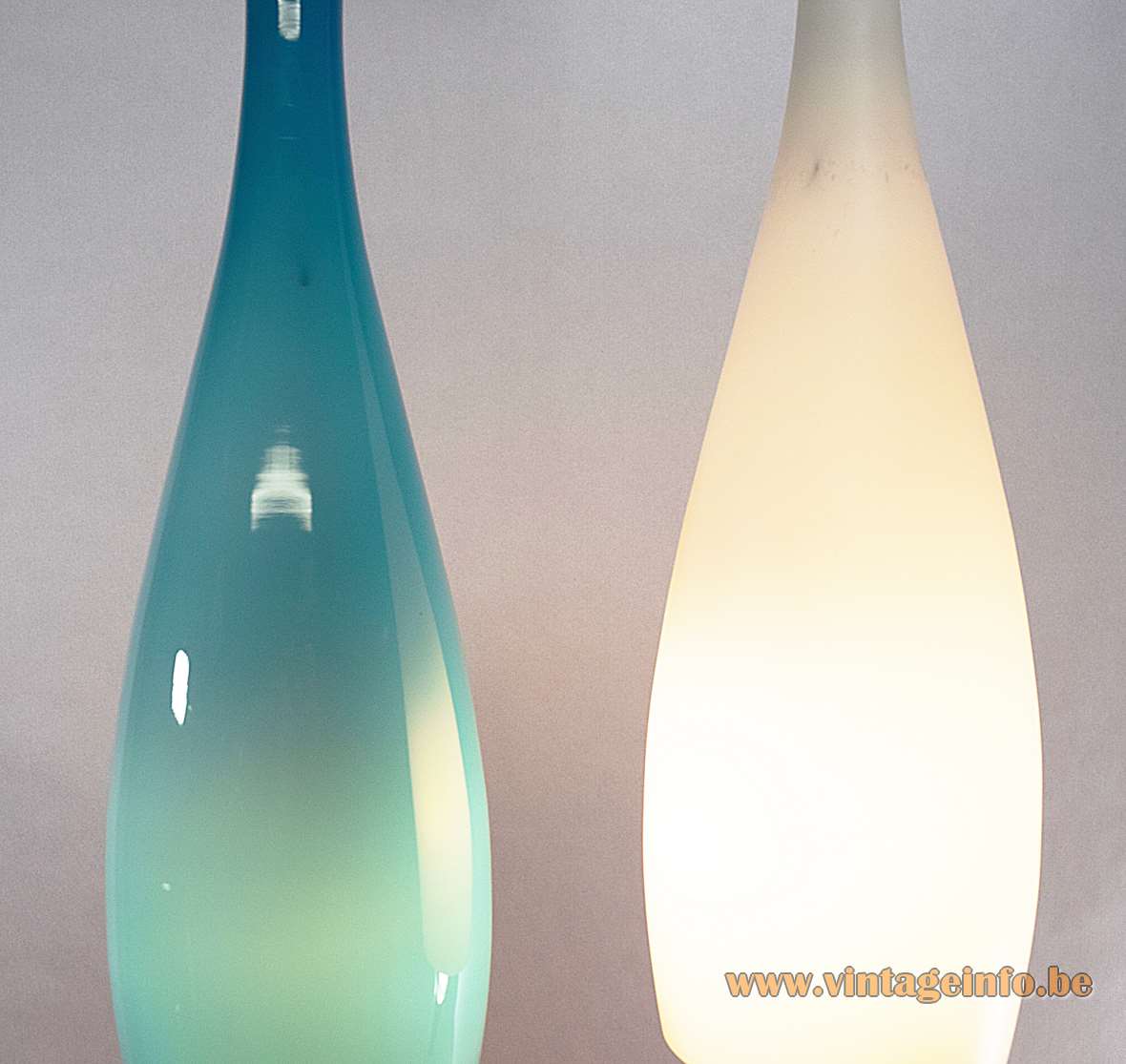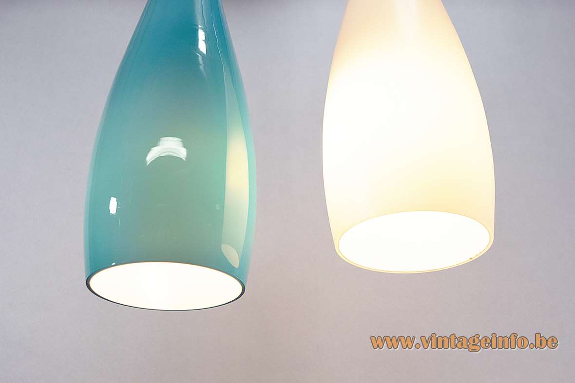 Materials: Droplet style convex lampshades. Made of clear turquoise and opal crystal hand blown glass. White opal glass on the inside (incamiciato). Bakelite E27 sockets.