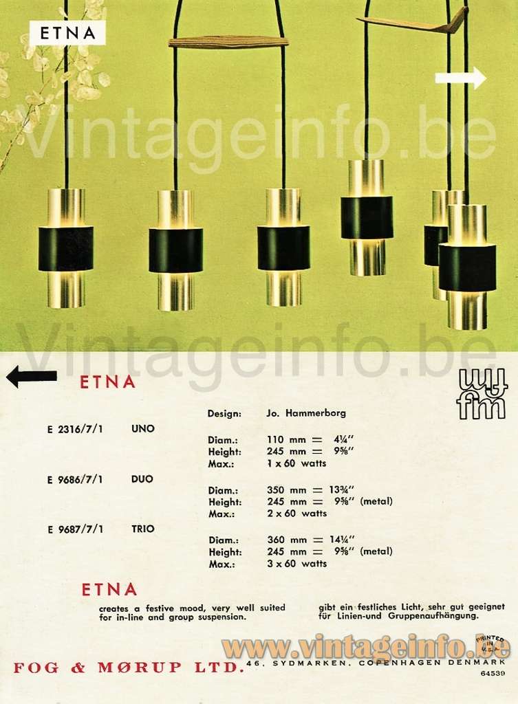 1960s UK catalogue. Fog & Mørup Etna pendant lamp models: Uno E2316/7/1,Duo E 9686/7/1 and Trio E9687/7/1.