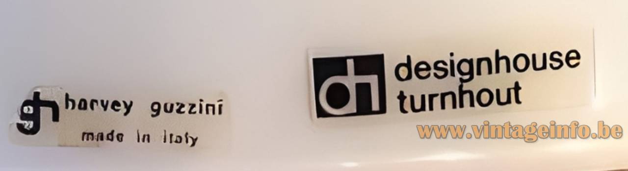 Labels on this pendant lamp. The Jolly was never sold under the name of Guzzini’s Design House brand. Design House Turnhout was a shop in the Belgian city Turnhout that sold Harvey Guzzini and Design House lamps. The shop ended business in the late 1990s. Unfortunately, no more information can be found about the company, other than that the daughter now lives in a castle in France.