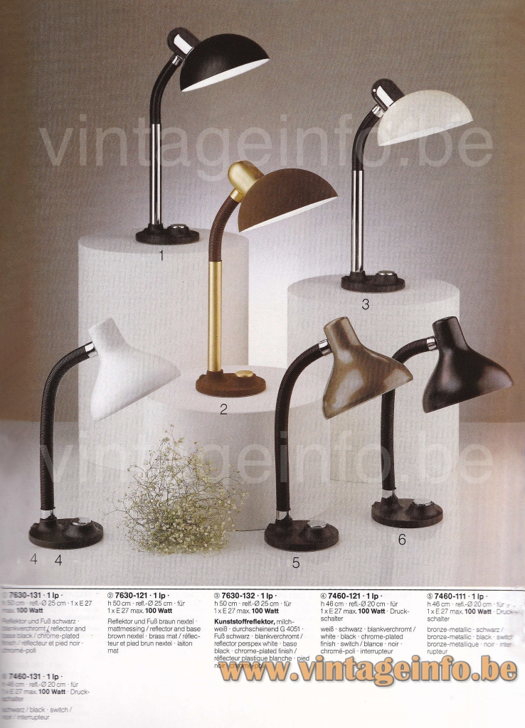 Other versions: This Hillebrand gooseneck desk lamp was also made in a black edition. The brass parts are chromed and the flexible adjustable gooseneck tube is black. It was sold for a very short time. This one isn’t even in the catalogue photo.