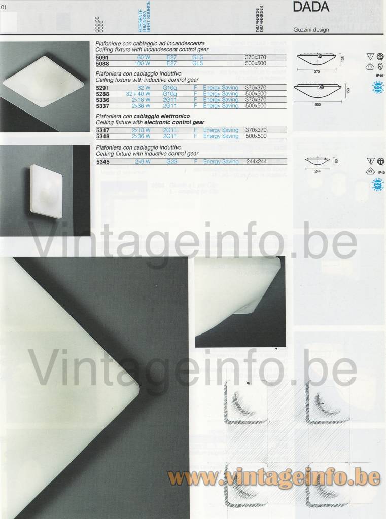Other versions: The iGuzzini Dada flush mount comes in several sizes with incandescent light bulbs E27, 60 watt and 100 watt. Also produced with 1 or 2 circular fluorescent lamps. The smaller versions are 37 x 37 cm and 24,4 x 24, 4 cm (model 5345). Also used as a wall lamp. Produced for a long time, from 1979 until 2005. The company produced a wide range of ceiling lamps in this style.