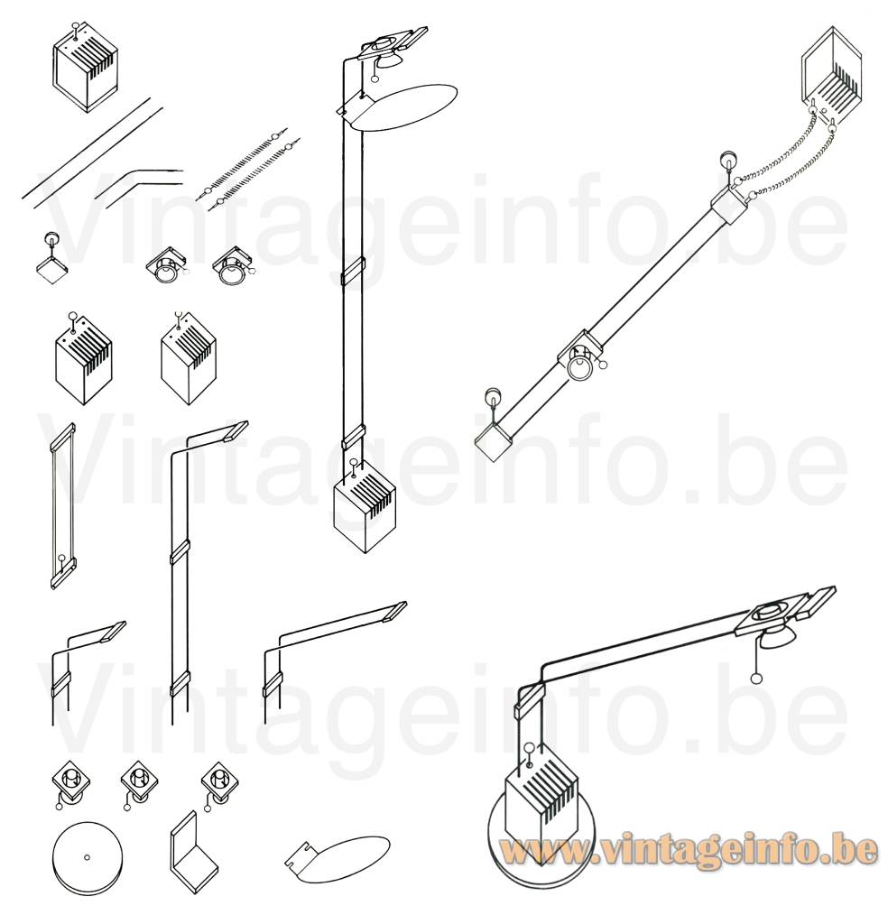 desk lamps, floor lamps, spotlights, wall and ceiling configurations, adapters, and interchangeable components. The system was conceived not as a single product, but as an expandable architectural lighting family.