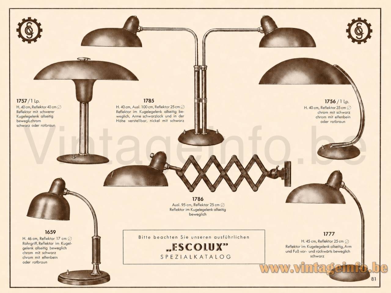 Schröder & Co. / Escolux catalogue: This catalogue page shows the same desk lamp as model 1757 / 1 Lp.. The lamp is generally known as the Schröder-Lampe or Schröder 2000, designed by Max Schumacher and usually associated with Metallwerk Werner Schröder from Lobenstein, Germany.