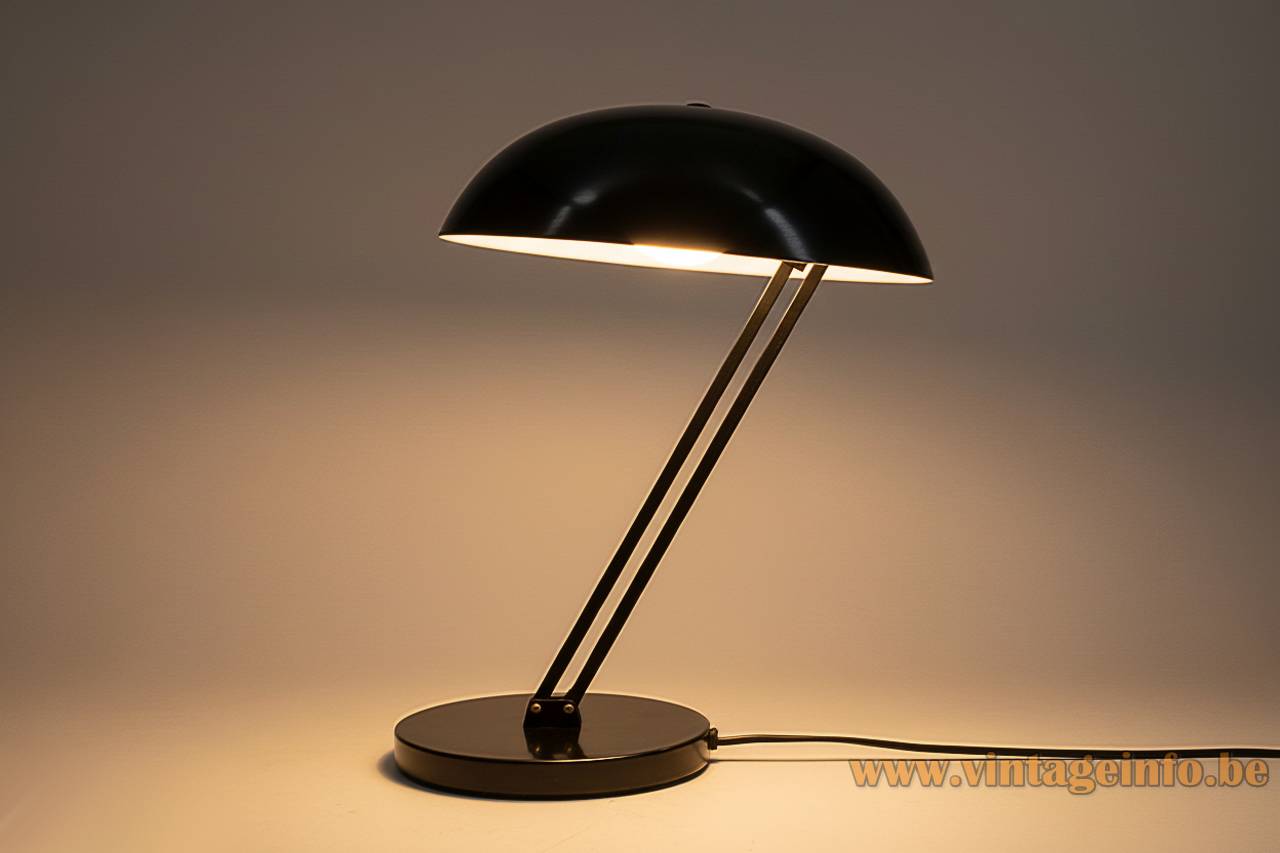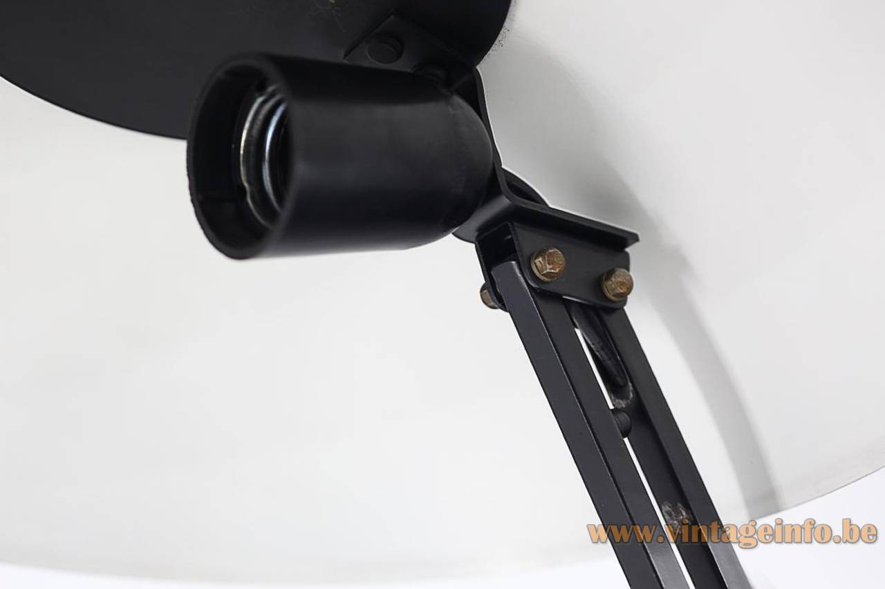 Materials: Round black painted metal base, cast iron counterweight inside. 2 adjustable black pained long square rods. Black painted mushroom lampshade, painted white inside. Black Bakelite E27 socket.