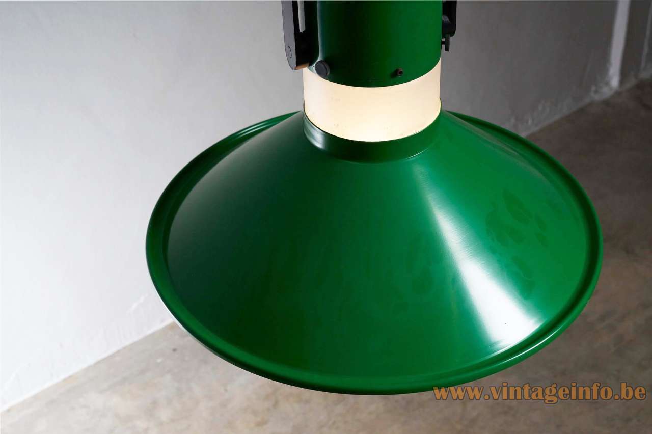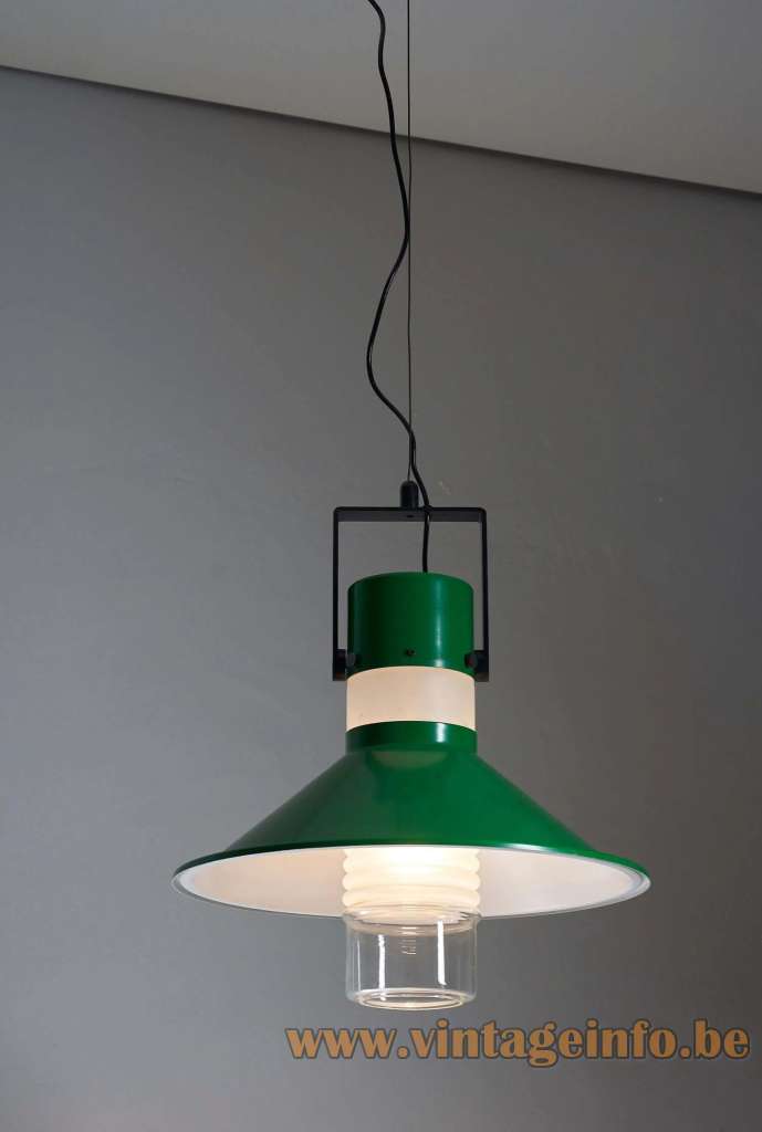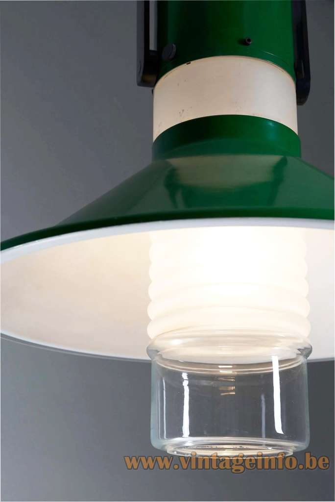 Materials: Industrial style grass green painted metal lampshade, painted white inside. Clear and opal glass diffusser below. Black painted metal handle on top. Steel wire, some metal parts. Porcelain E27 socket.
