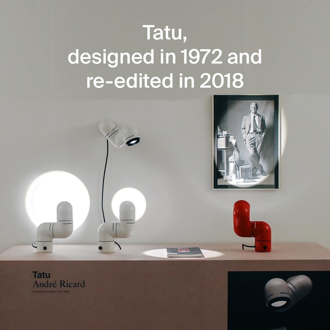 The tatu, or armadillo, is a friendly mammal with a shell on its back that protects it when it rolls up into a ball. On a transoceanic flight, while reading about Argentinean wildlife and contemplating how the light above his seat did not disturb his sleeping wife next to him, André Ricard came up with this lamp that became a pop-art icon in Europe.