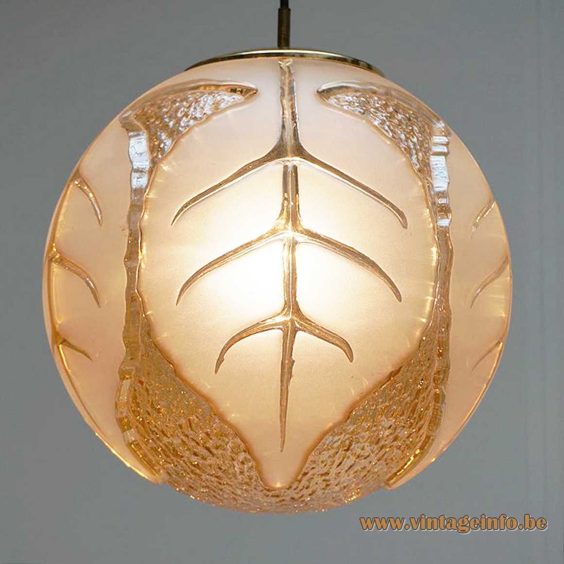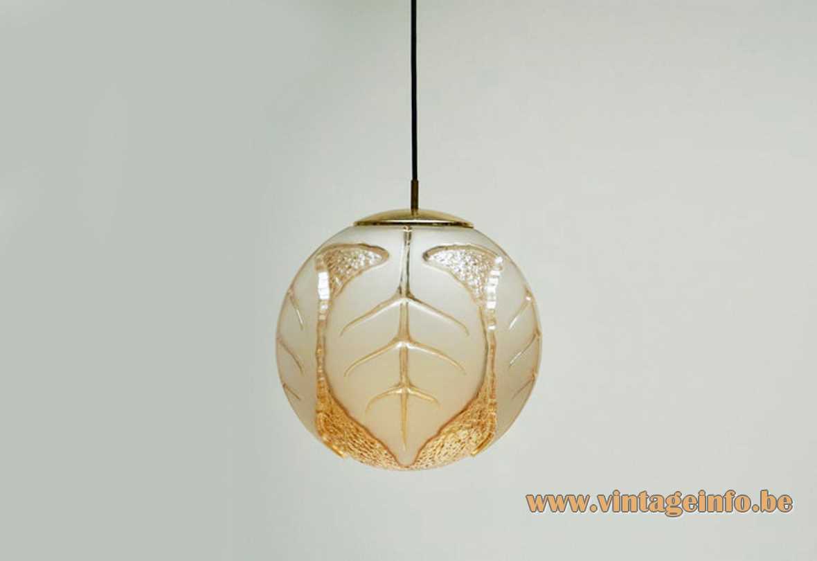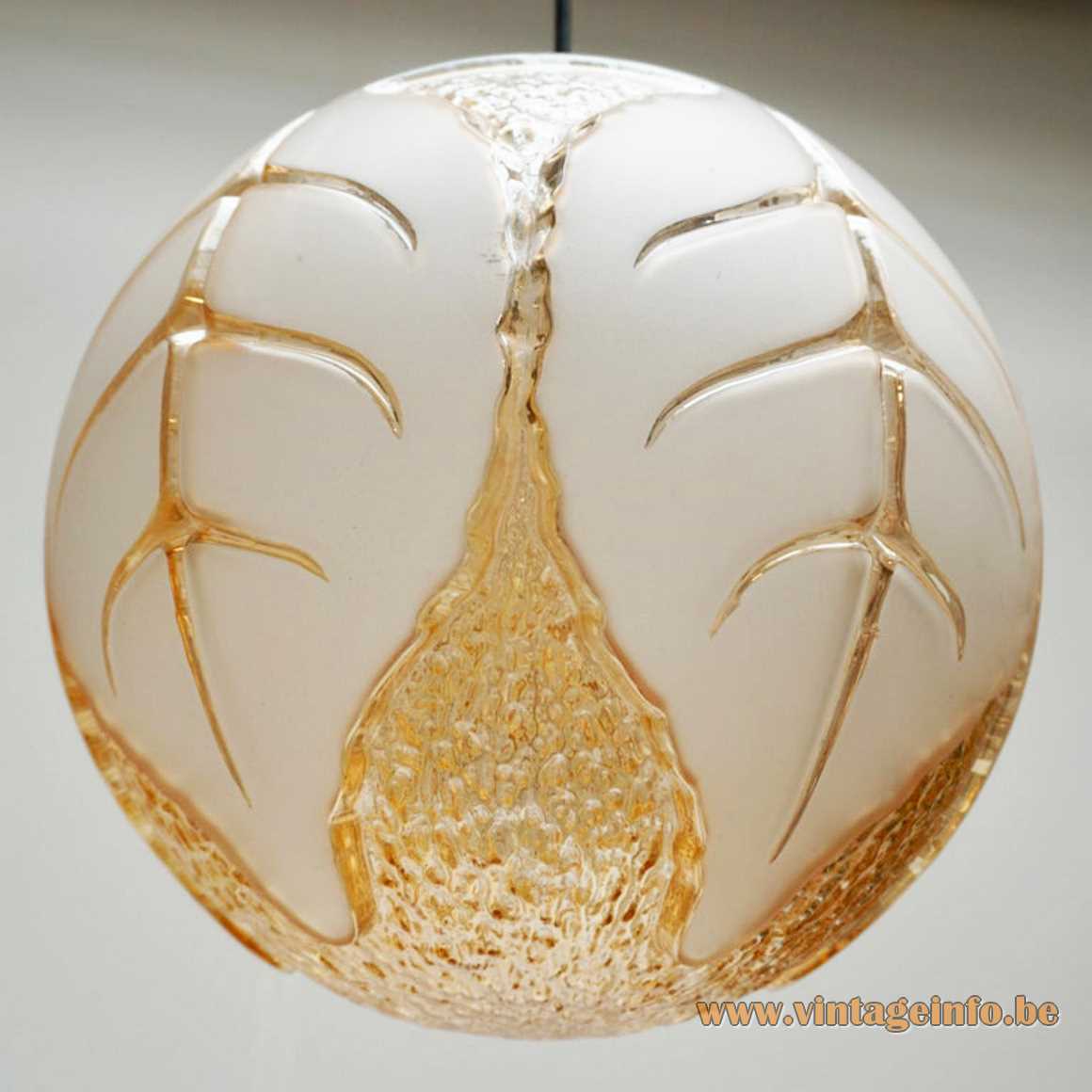 Materials: Amber hand blown glass globe lampshade. Frosted leaves design. Chromed metal (iron) parts. Black plastic tube and canopy. Bakelite E27 socket.