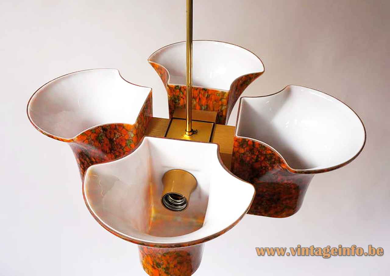 Materials: 4 hand blown speckled brown-yellow-orange chalices lampshades. Brass parts & rod. 4 Bakelite E27 sockets.