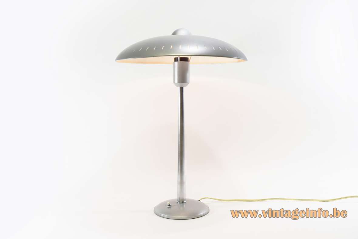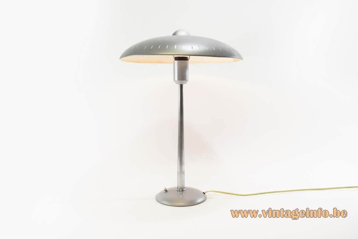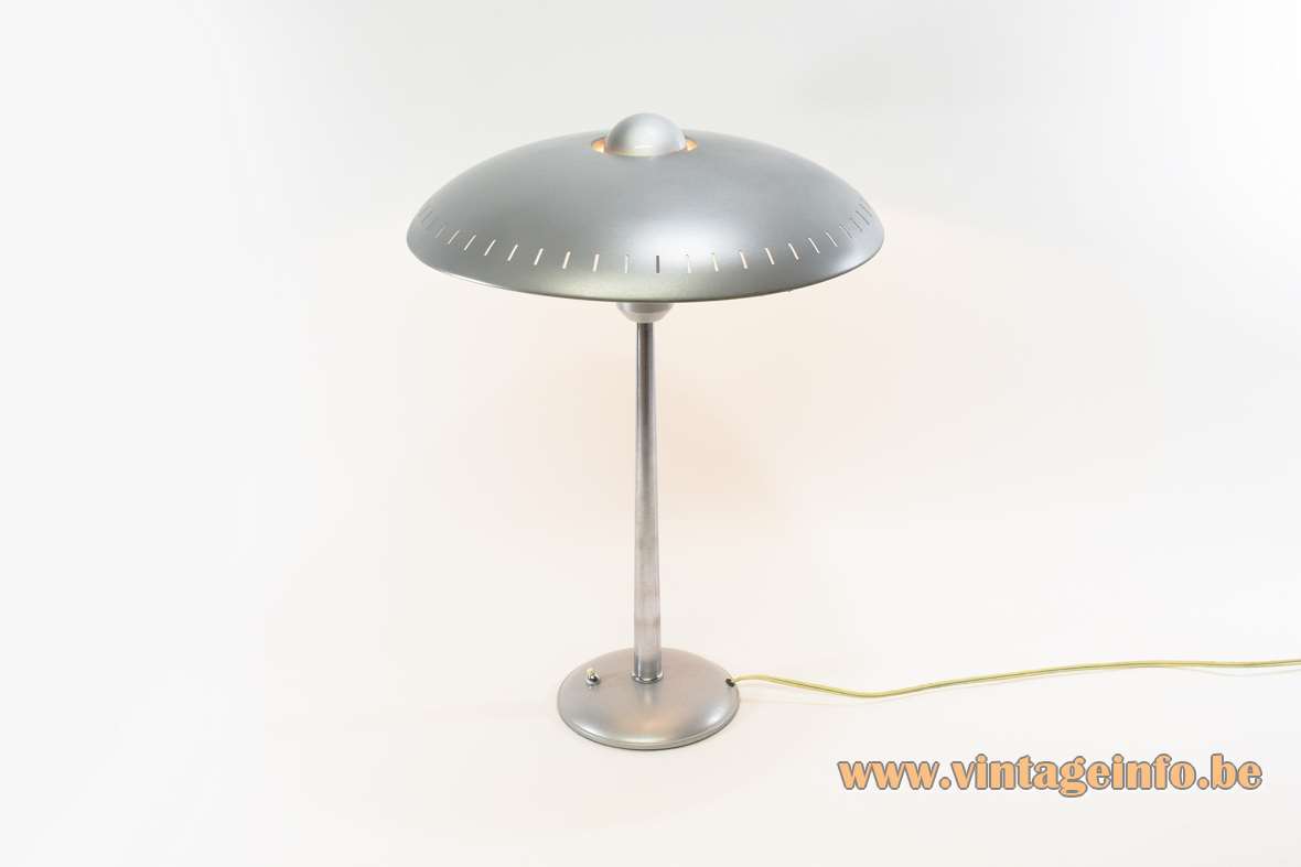 Other versions: The Philips Senior table lamp comes in many different colours. It is also produced with a copper or brass rod. These lamps were made in several sizes. The biggest lamp, +- 60 cm / 23” high was for a 200 watt bulb. They were made in several varieties over the years. A blue, turquoise version with other parts can be found here, on Vintageinfo.