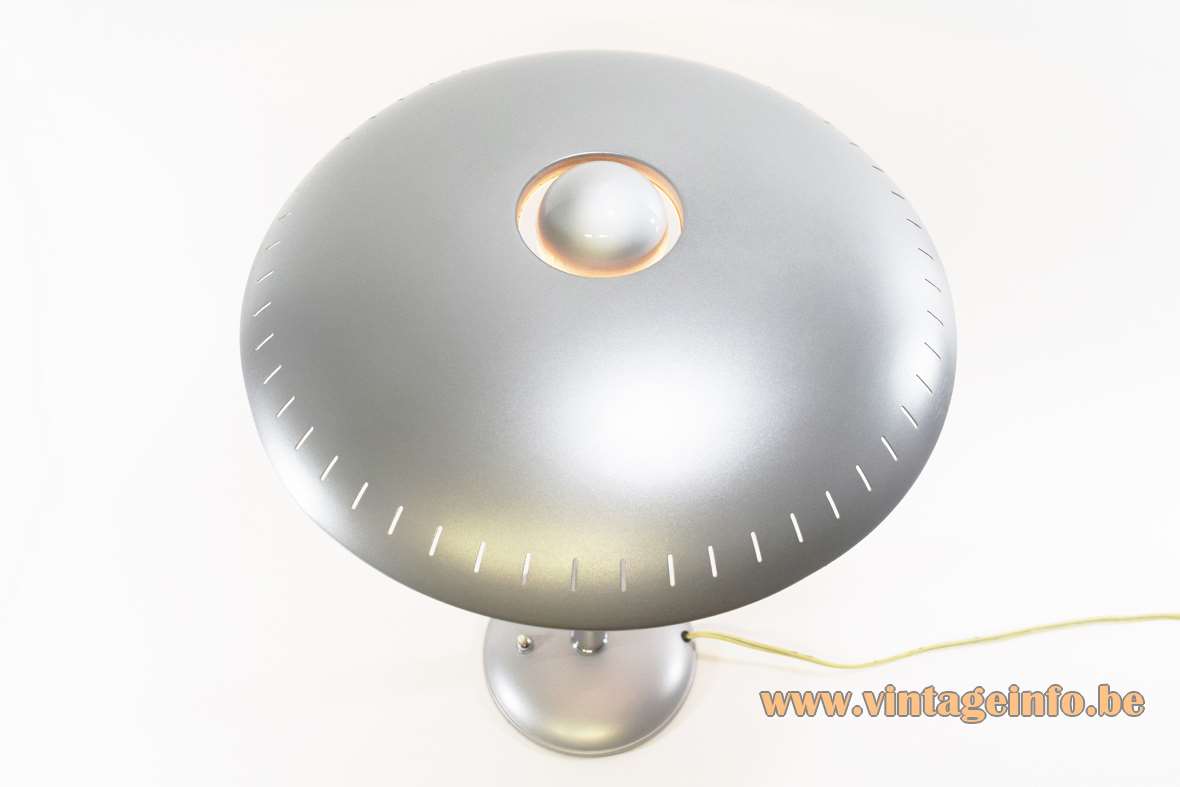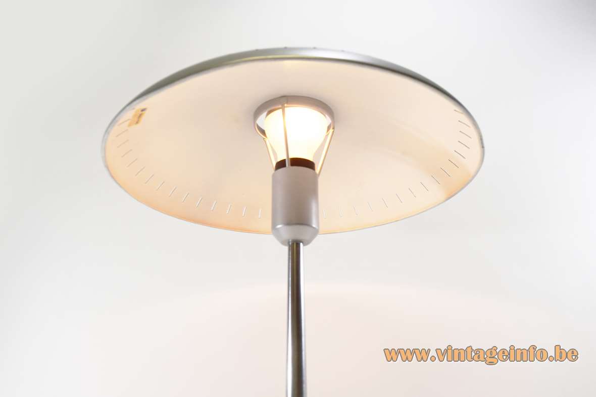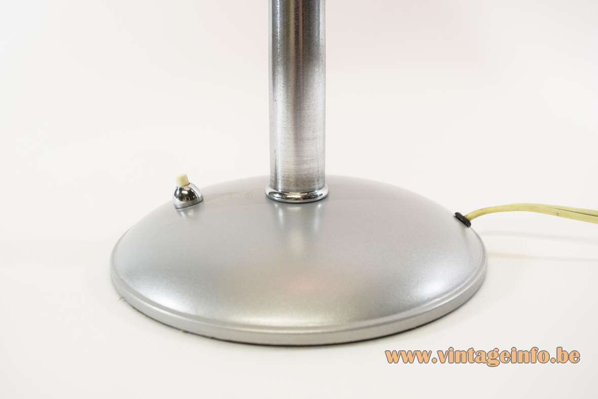 Materials: Round silver painted curved base, cast iron counterweight inside. Built-in switch. Stainless steel conical rod, brass rod inside. Silver painted aluminium mushroom lampshade with elongated slots and a whole in the middle. Painted white on the inside. Some metal parts. Chrome ring. Bakelite E27 socket.