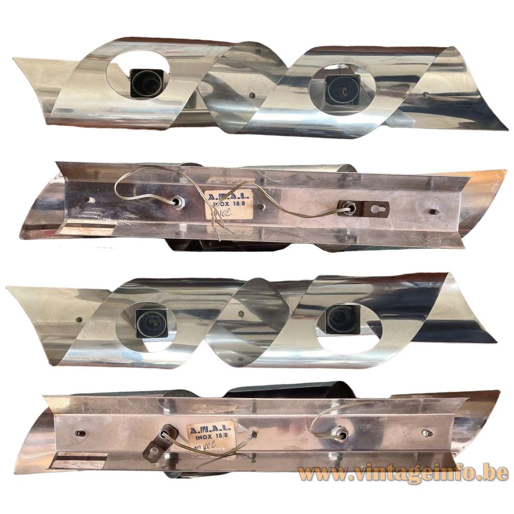 Other versions: This Polam stainless steel wall lamp exists in several variations. Table lamps, pendant lamps and chandeliers  were also made. Several of these lamps appear together as you can see below in the catalogue picture. They exists in many colours.