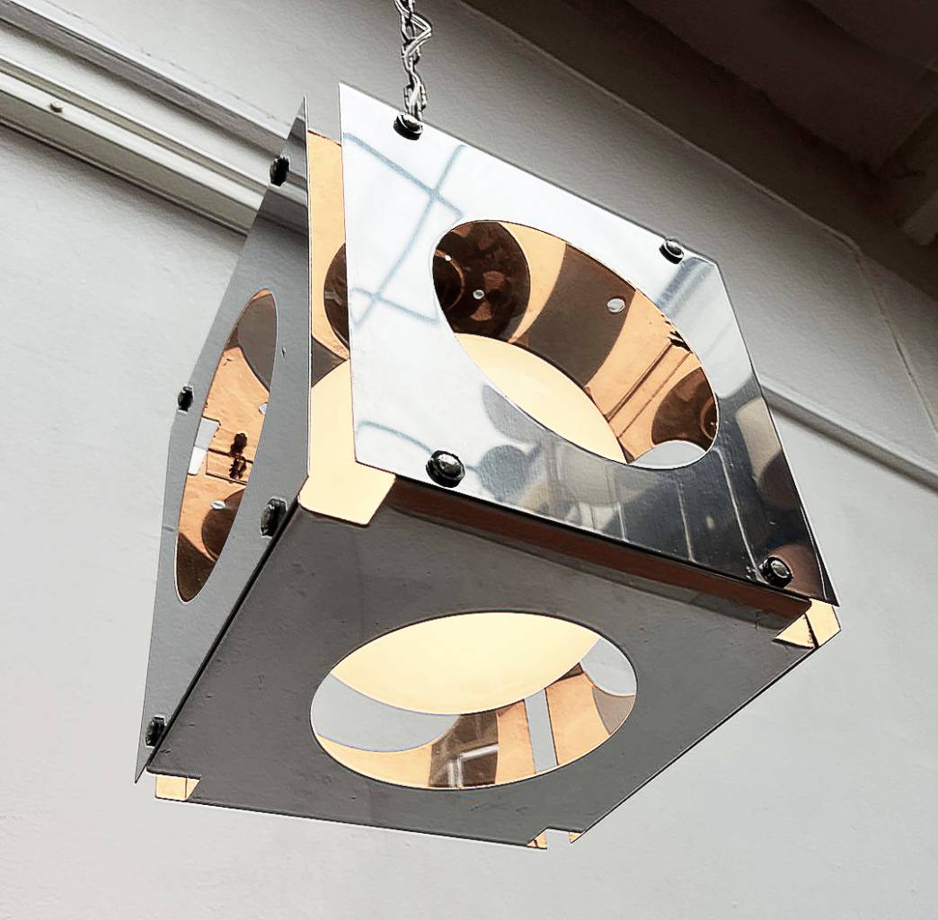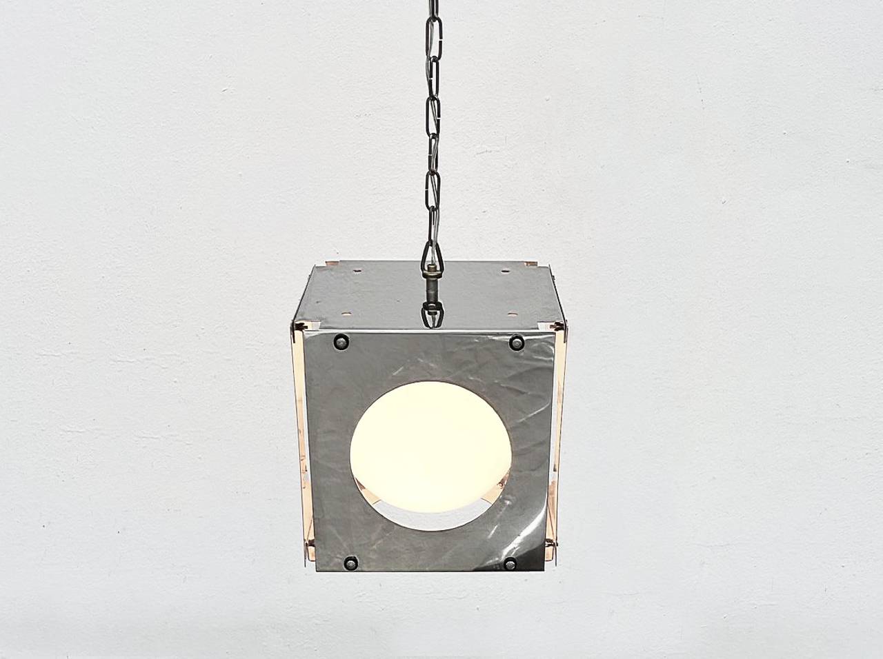 Materials: Opal glass globe lampshade. Chromed metal (iron) cube box with round holes on every side, closed on top. Metal chain. Some metal parts. E27 Bakelite socket.