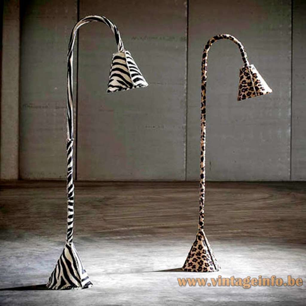 Other versions: This Velanti leather floor lamp exists in several colours. Black, maroon, brown… A complete brass version also exist. More than 65 skins can be chosen, also a jaguar and zebra print and one in a cowhide. A table lamp was also made, it is no longer in production. Lamps can be ordered in any skin you want.