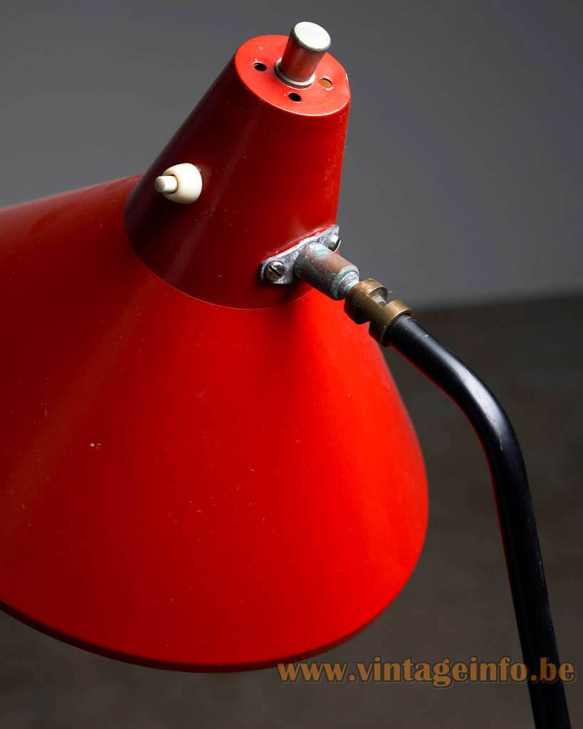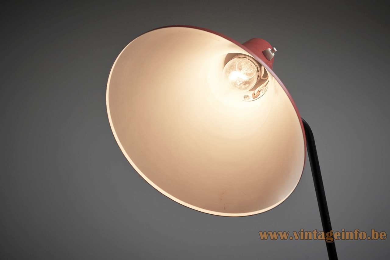 Materials: Black painted thin metal (iron) tripod rods base. Red painted conical aluminium lampshade with a built-in switch. Bakelite E27 socket.